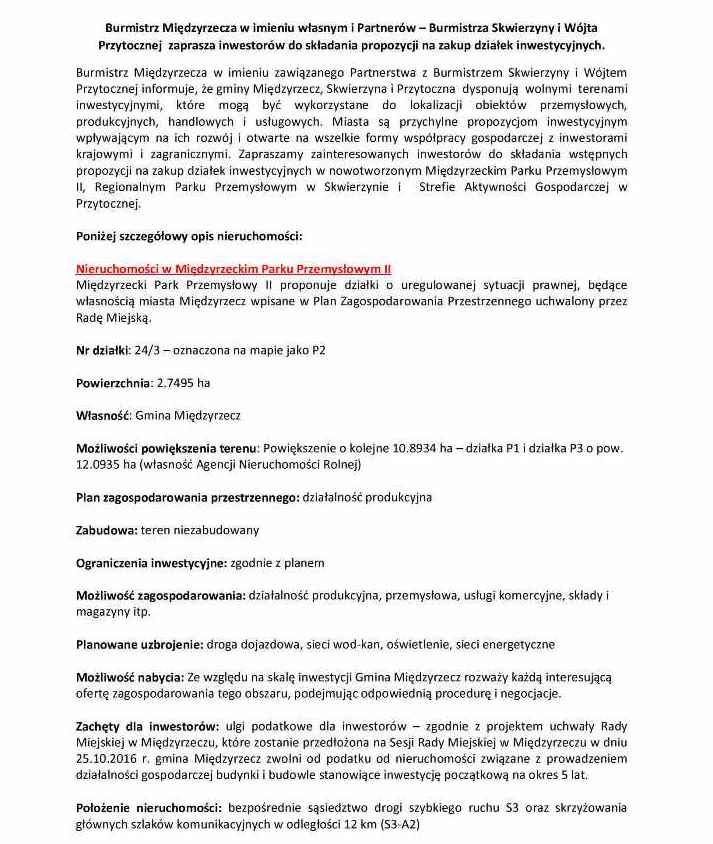 Burmistrz Międzyrzecza w imieniu własnym i Partnerów - burmistrza Skwierzyny i wójta Przytocznej zaprasza inwestorów do składania propozycji na zakup działek inwestycyjnych