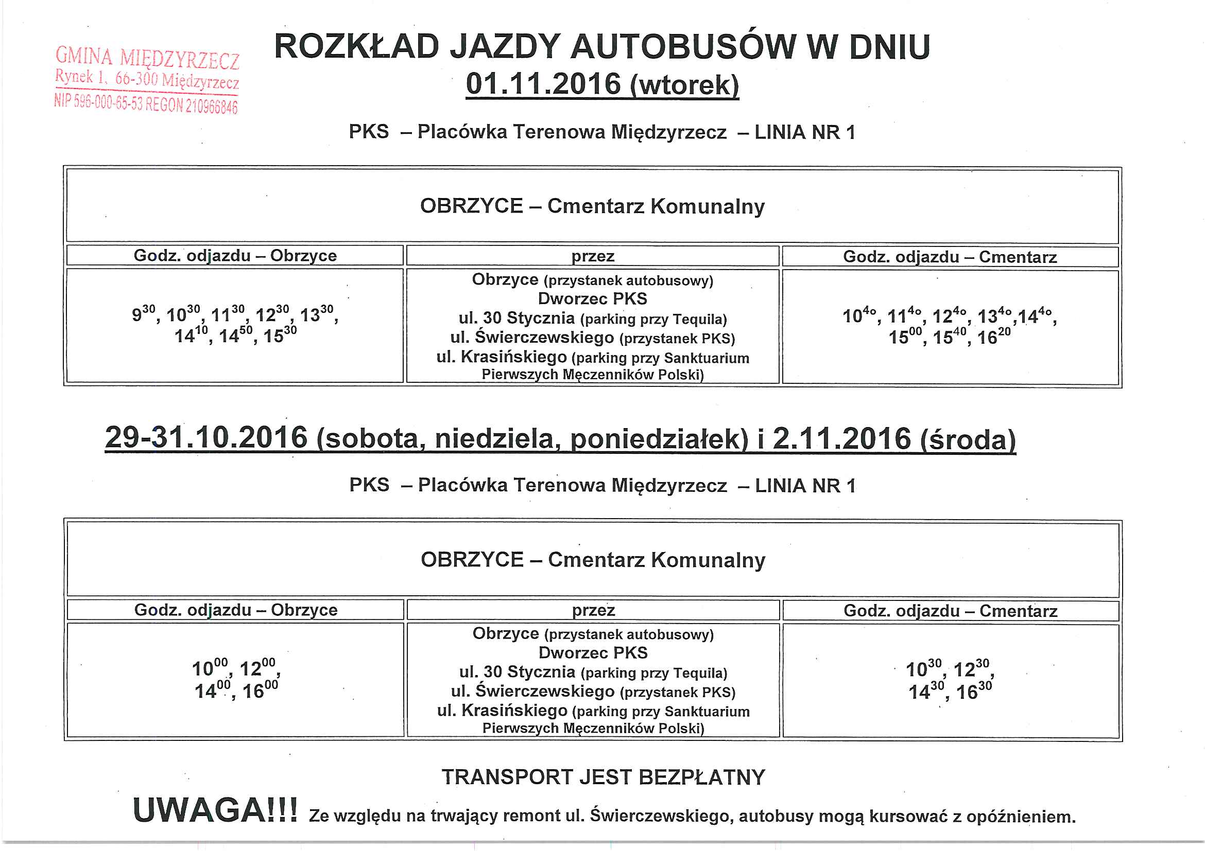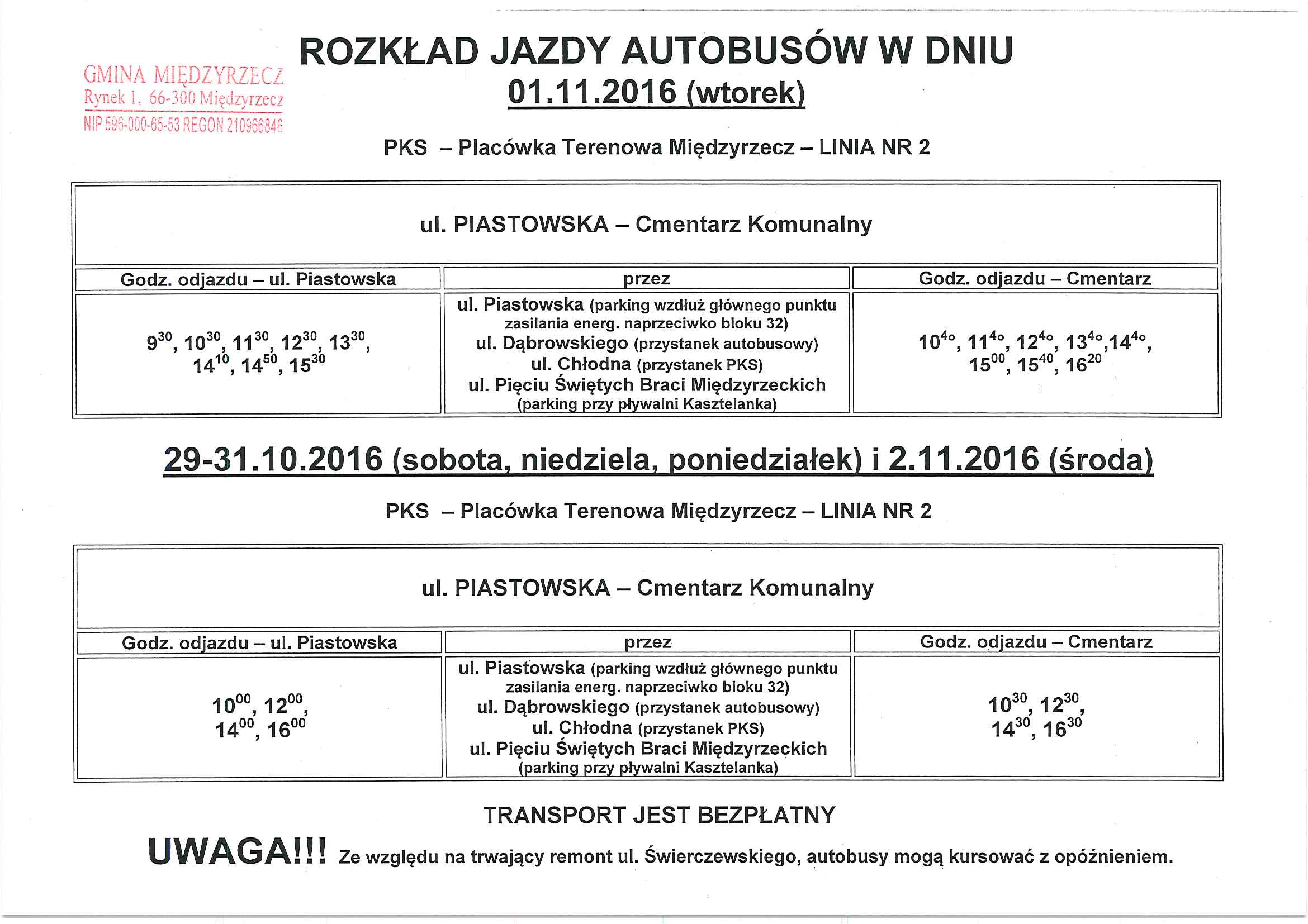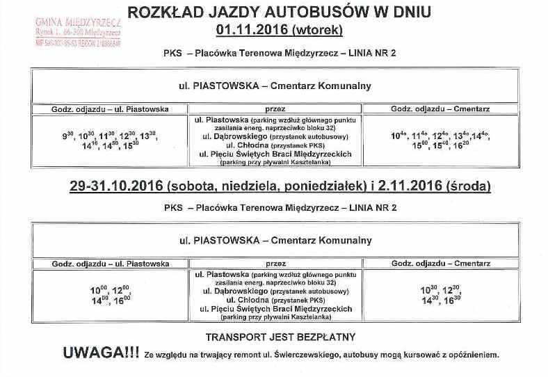 Rozkład jazdy autobusów w dniach 29-31.10-2.11.2016