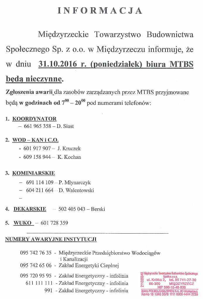 Informacja z MTBS - ważne telefony