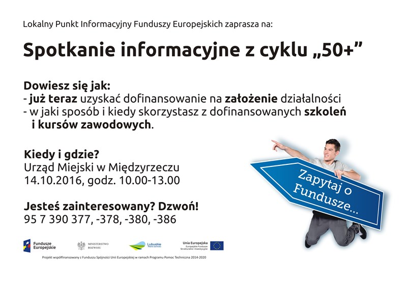Lokalny Punkt Informacyjny Funduszy Europejskich w Gorzowie Wielkopolskim, działający w Urzędzie Marszałkowskim Województwa Lubuskiego, zaprasza na spotkanie informacyjne pod nazwą „50+”, które odbędzie się 14 października 2016 r. o godz. 10:00 w Międzyrzeczu.