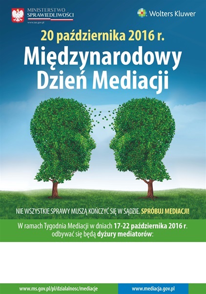 W tym roku Międzynarodowy Dzień Mediacji przypada na 20.10.2016 r. natomiast Tydzień Mediacji obchodzony będzie od 17 do 22 października br. Oba projekty będą przebiegały pod hasłem „Masz prawo do mediacji”. Koncepcja tegorocznych obchodów opiera się przede wszystkim na propagowaniu inicjatyw oddolnych – włączeniu środowisk lokalnych do działań prowadzonych przez koordynatorów ds. mediacji w sądach powszechnych, a także prezesów sądów i sędziów oraz na współpracy pomiędzy ośrodkami mediacyjnymi, praktykami wymiaru sprawiedliwości i Ministerstwem Sprawiedliwości.