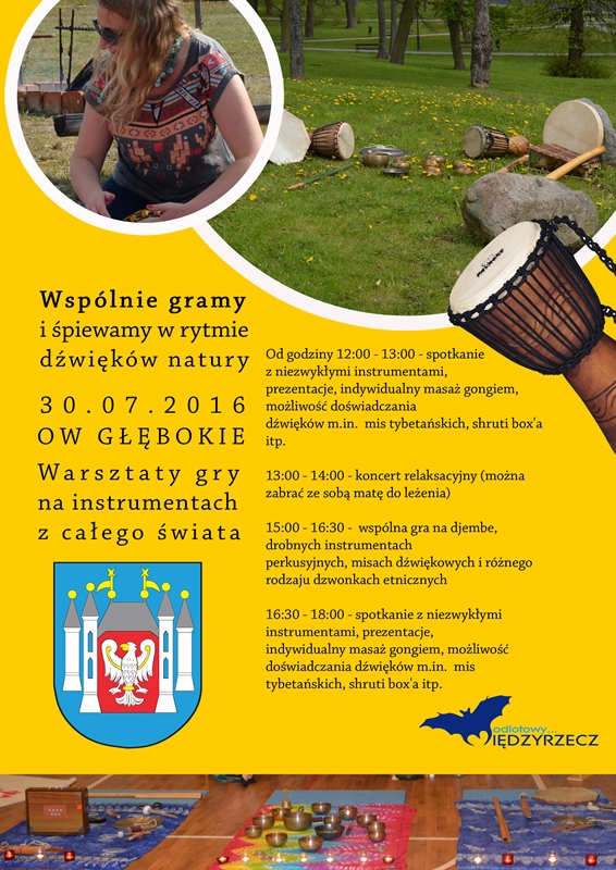 Już w najbliższą sobotę, 30 lipca od godz. 12:00 zapraszamy na Ośrodek Wypoczynkowy Głębokie, który wypełnią egzotyczne dźwięki bębnów, mis tybetańskich i innych etnicznych instrumentów z całego świata! Zapraszamy wszystkich turystów oraz mieszkańców naszej gminy do wspólnej zabawy!