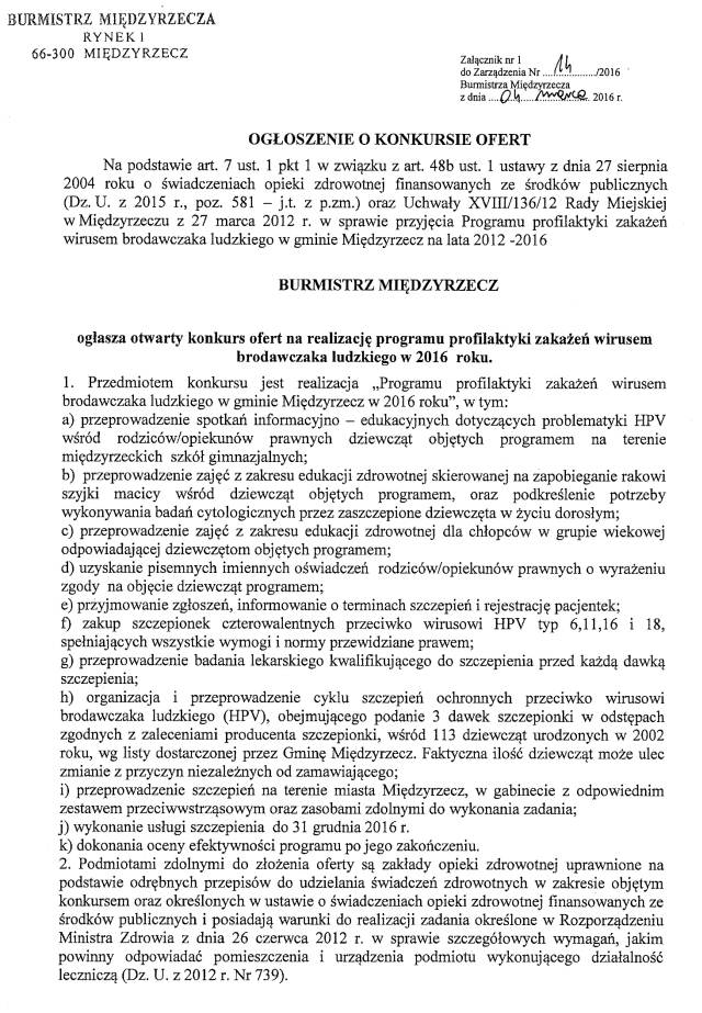 Ogłoszenie o konkursie ofert na realizację programu profilaktyki zakażeń wirusem brodawczaka ludzkiego w 2016 r.