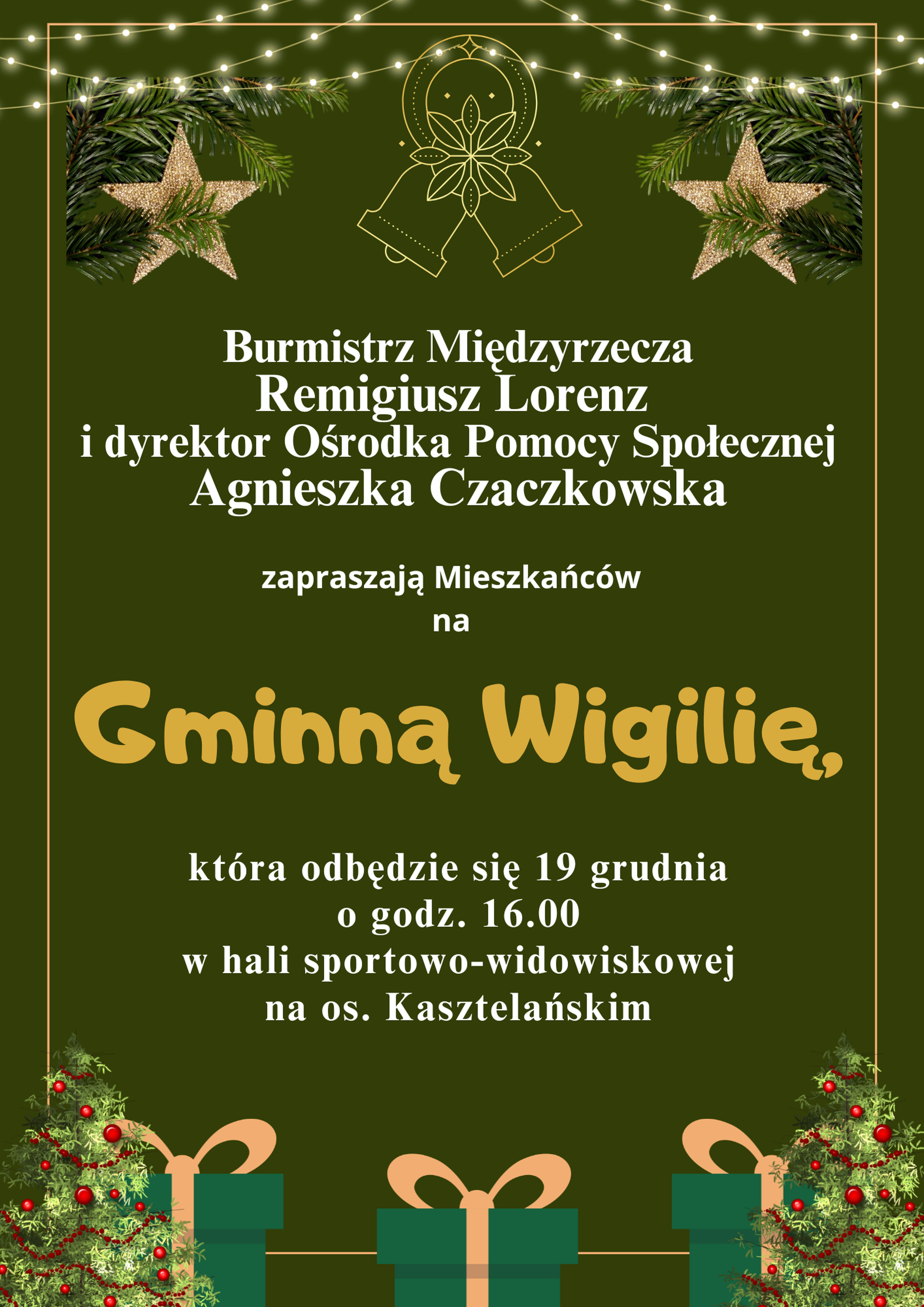 Burmistrz Międzyrzecza Remigiusz Lorenz i dyrektor Ośrodka Pomocy Społecznej Agnieszka Czaczkowska zapraszają Mieszkańców na Gminną Wigilię, która odbędzie się w czwartek, 19 grudnia, o godz. 16.00 w hali sportowo-widowiskowej na os. Kasztelańskim.