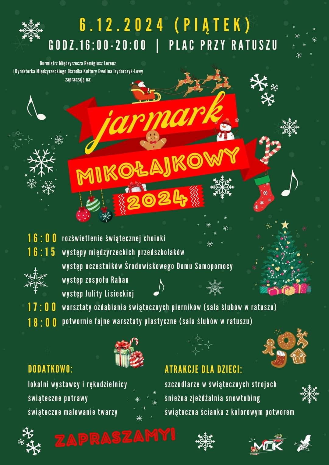 Burmistrz Międzyrzecza Remigiusz Lorenz i dyrektorka Międzyrzeckiego Ośrodka Kultury Ewelina Izydorczyk-Lewy zapraszają Mieszkańców na Jarmark Mikołajkowy, który odbędzie się w piątek, 6 grudnia, na rynku wokół ratusza.
