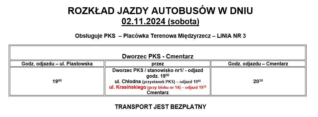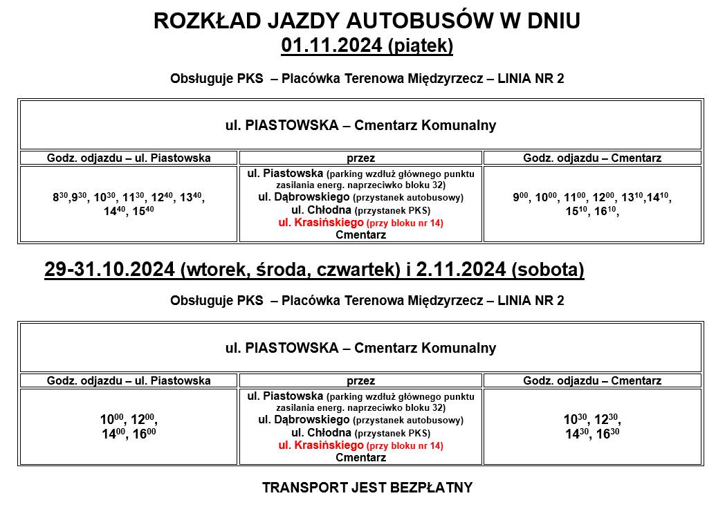Rozkład jazdy autobusów w dniach od 29 października do 2 listopada.