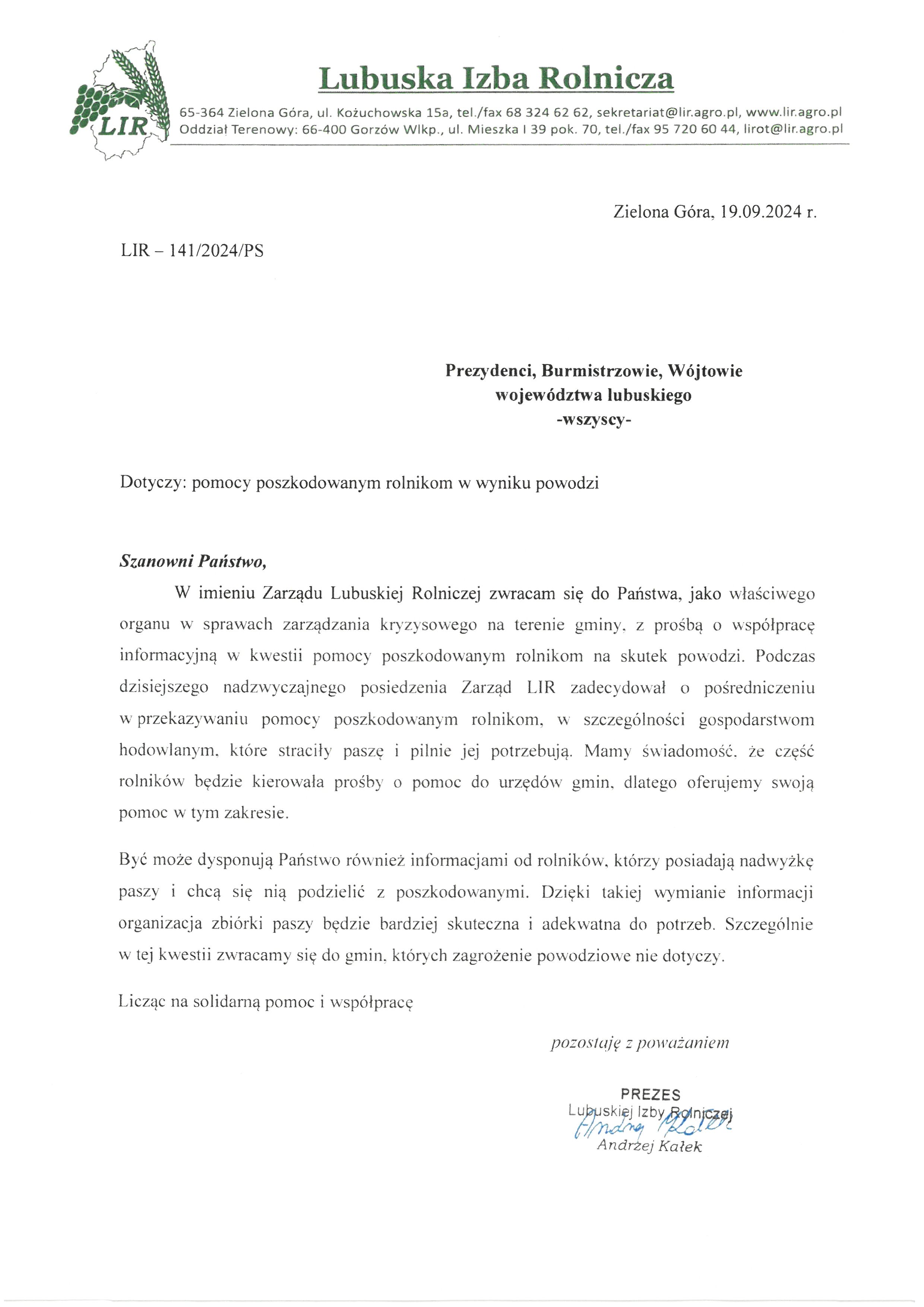 Rolnicy, którzy posiadają nadwyżkę paszy i mogą się nią podzielić z poszkodowanymi proszeni są o kontakt z Lubuską Izbą Rolniczą w Zielonej Górze, telefon: 683246262 lub z Urzędem Miejskim w Międzyrzeczu, ul. Rynek 1, telefon: 957426949.