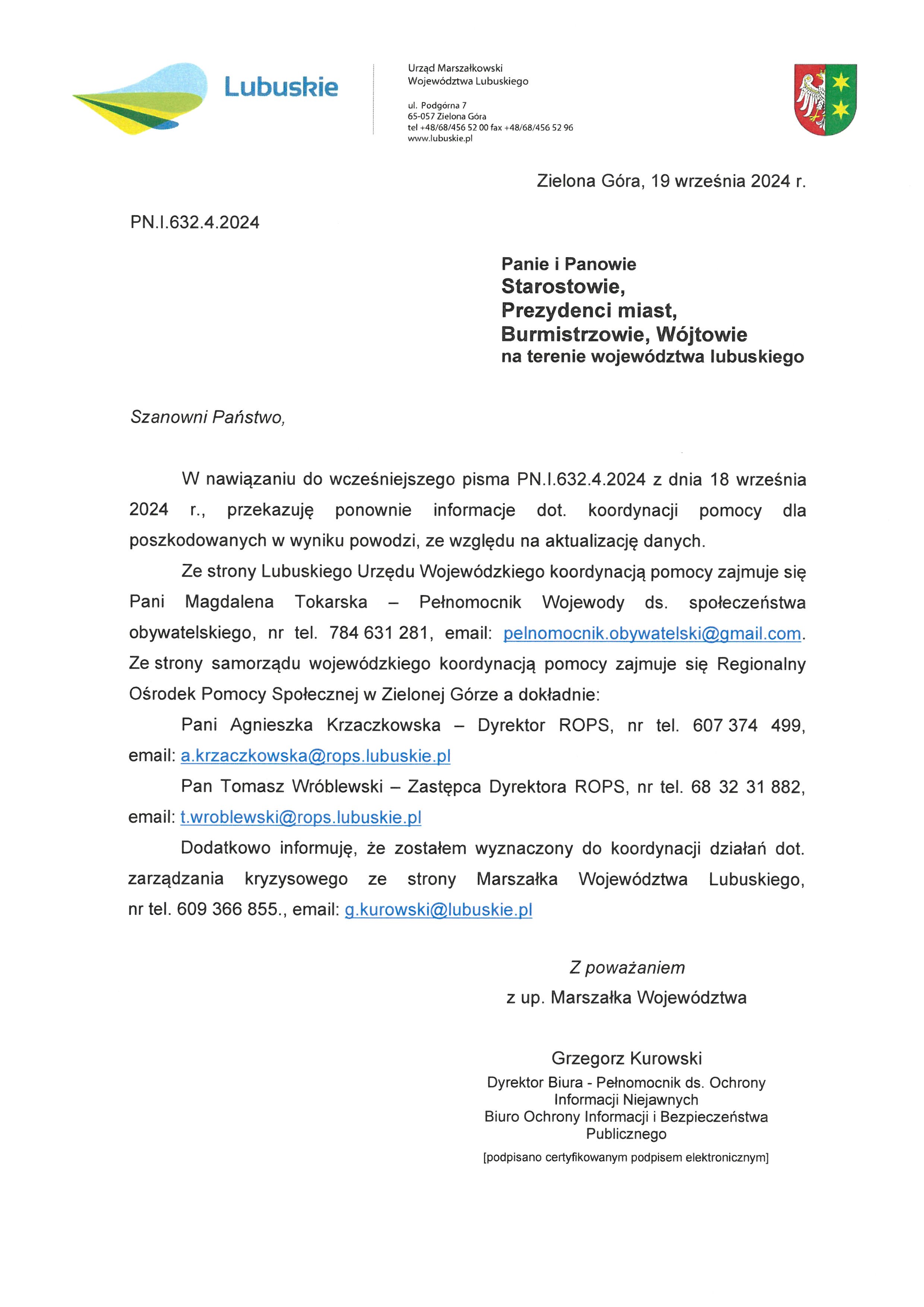Informacja z Urzędu Marszałkowskiego Województwa Lubuskiego dotycząca koordynacji pomocy dla poszkodowanych podczas powodzi.