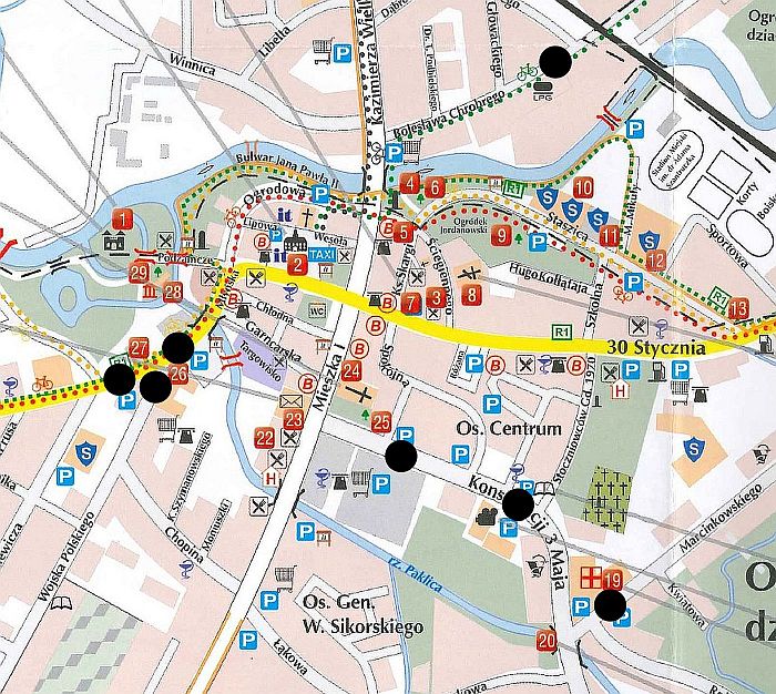 Plan miasta z zaznaczonymi przejściami, które zostaną oświetlone.